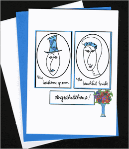 A double portrait of a handsome groom and beautiful bride appear above a beautiful vase of flowers and "Congratulations!".