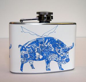 Distinctive and portable hip flask is wrapped with Liz's groovy paisley pig in blue and with wings.