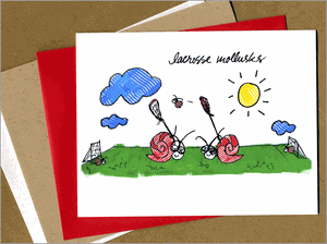 Two snails in full lacrosse gear enjoy a brisk game on a beautiful day. "Lacrosse mollusks" is written in the sky above the playing field.