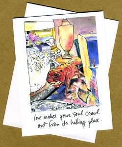 A delightful wooden tiger strolls among a forest of wonderful treasures atop an antique table. Watercolor image is printed on heavy white stock from sustainable forests and comes with matching white envelope.