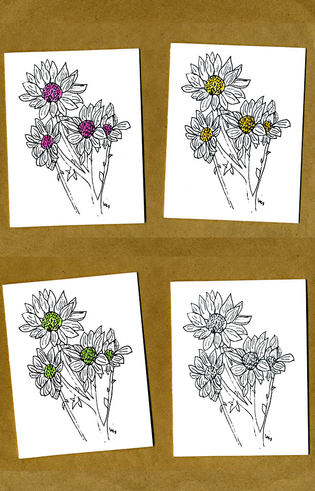 Liz's drawing of daisies she received in a gift of flowers from a friend. This version is the pink version. Also available with yellow, white or green centers or as a variety set with two of each color.