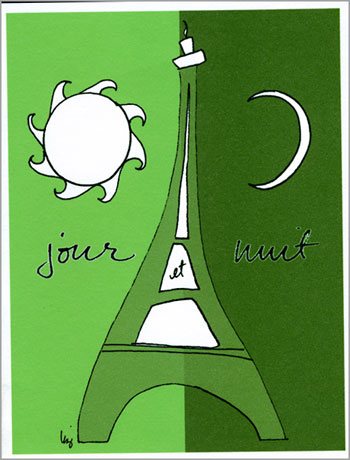 A jazzy Eiffel Tower in green makes the scene as it sways between night and day (or as in French, between day and night). Use this card for very modern looking notes "Jour et Nuit" or whenever the correspondence muse inspires you to put pen to luxurious paper.