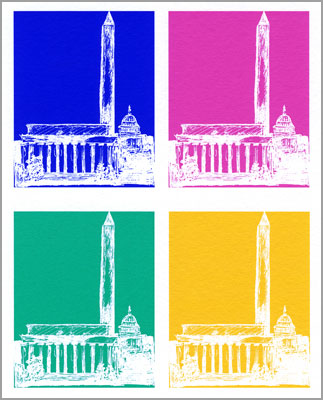 Four squares feature a drawing of a west to east vista of the National Mall and its signature skyline. Chalky white lines outline the Lincoln Memorial, Washington Monument, and U.S. Capitol against crisp and cool sherbert colors. Printed with archival inks on premium 100% cotton archival fine art paper.