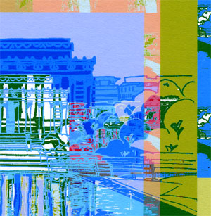 Blues, greens, peach and pinks layered over more greens and blues create a fascinating kaleidoscopic image of the Lincoln Memorial and its reflections.