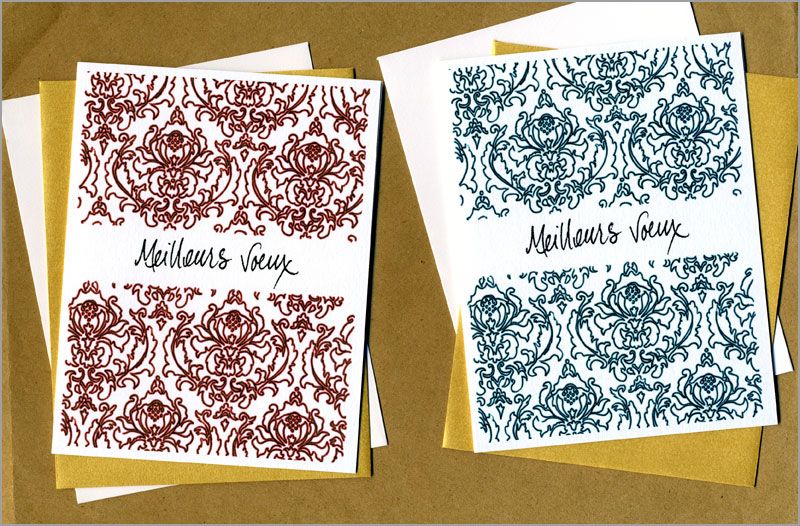 Sophisticated damask design is here to send your holiday messages in style. Meilleurs Voeux (Season's Greetings in French) appears on the front of the card.